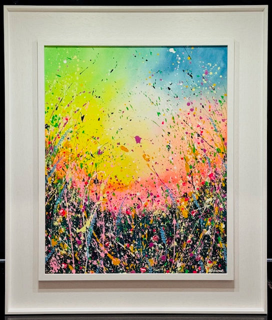 Sunlit Meadow has been framed in an elegant St Ives, white wooden frame. The frame is 8.5cm wide by 3cm deep and is ready to hang.