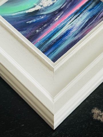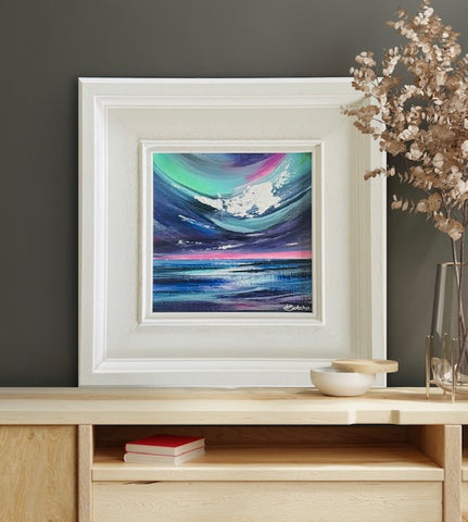 This acrylic painting has been painted onto a wooden box canvas and framed within a beautiful ,chunky white bespoke frame. The frame size is 20cm x 20cm and the paintings size is 12cm x 12cm.