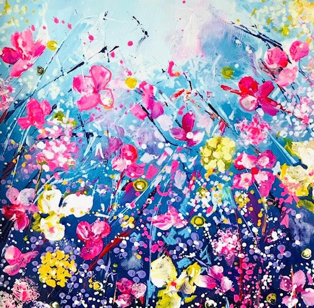 The joy of summer on your wall all year round. This pretty painting on canvas paper is fresh and crisp like a summers morning and is framed within a deep white, 3D box square frame and is 35cmx35cm in size.